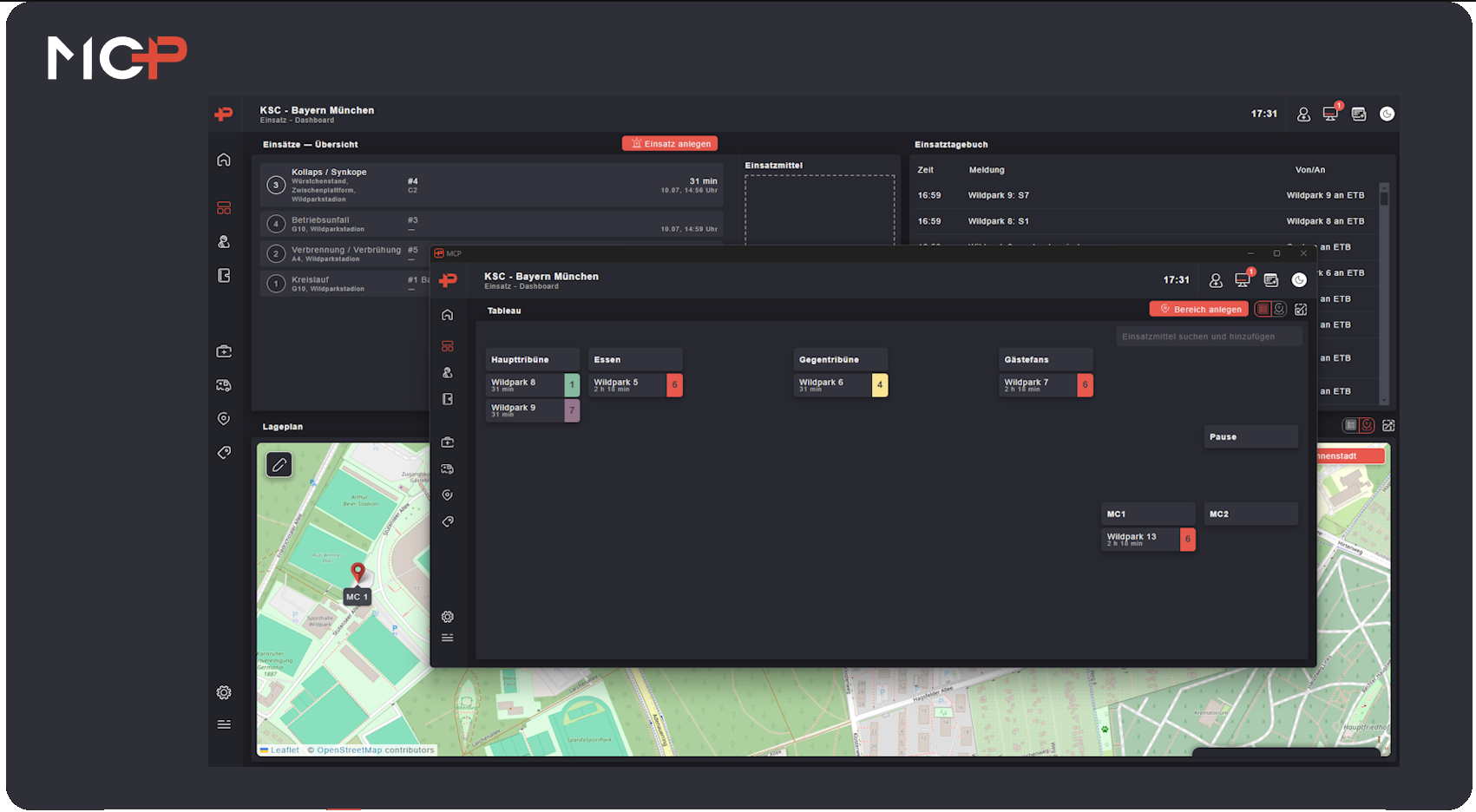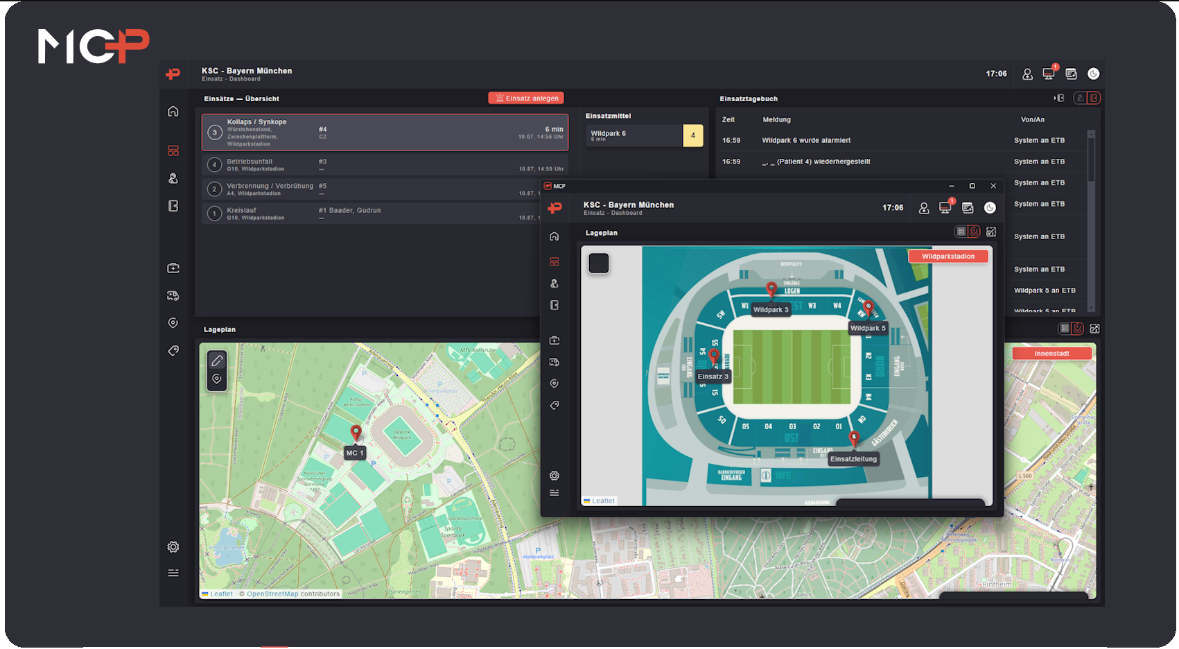Unser neues Lageplan-Feature erlaubt es den in MCP angelegten Orten eine beliebige Anzahl an Lageplänen hinzuzufügen. Das können Straßenkarten sein, die Ihr durch Eingabe einer Adresse oder von Geo-Koordinaten diekt in MCP erstellen könnt, aber auch beliebige Bilddateien, z.B. mit Übersichtsplänen von Innenräumen oder Stadien. Die Pläne können alternativ zur Übersicht der Einsatzmittel im Einsatzdashboard angezeigt werden, und es können beschriftete Markierungen darauf angebracht werden. Die Karten sind zoombar, und können auch im Vollbildmodus (s.u.), z.B. auf einem zweiten Monitor, angezeigt werden. Wir planen das Lageplan-Feature zukünftig um weitere nützliche Funktionen zu erweitern. Es ist möglich während eines Sanitätsdienstes mit mehreren Lageplänen gleichzeitig zu arbeiten.
