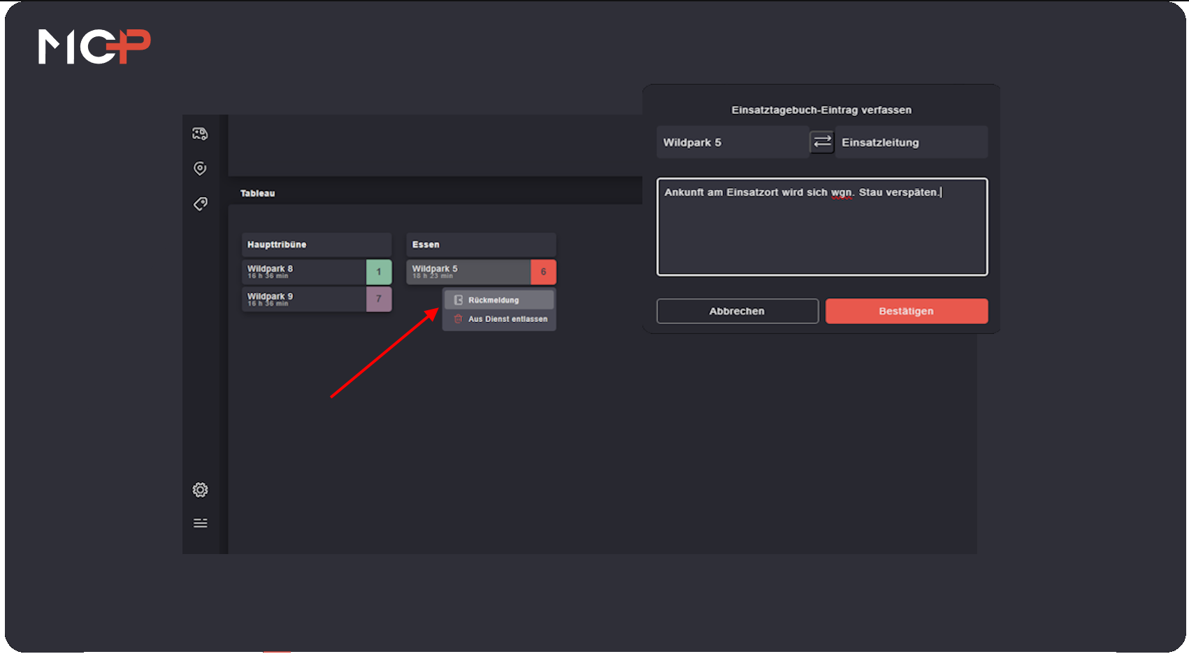 Um Rückmeldungen von Einsatzmitteln im Einsatztagebuch zu protokollieren, musste man bisher in die Ansicht des ETB wechseln, und dort alle Angaben, wie Absender und Empfänger der Meldung, manuell eingeben. Jetzt reicht dazu ein Rechtsklick auf das entsprechende Einsatzmittel direkt im Dashboard, und nach Auswahl des Menüpunkts “Rückmeldung” öffnet sich ein Formular, in dem Absender und Empfänger der Meldung bereits vorausgefüllt sind. Befindet sich das betreffende Einsatzmittel gerade in einem Einsatz wird die Meldung auch automatisch diesem Einsatz zugeordnet.