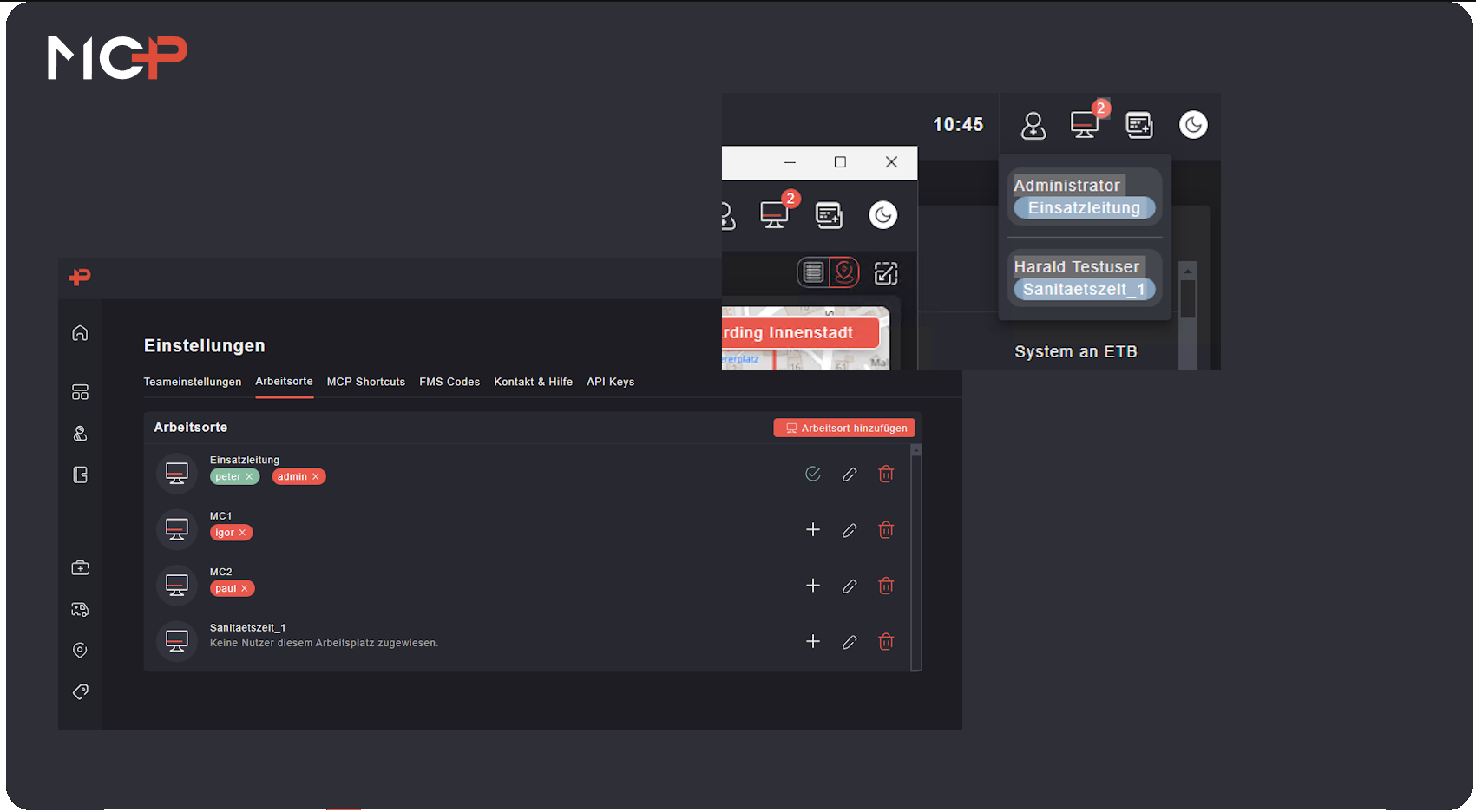 Der untere Teil des Einsatz-Dashboards, indem jetzt wahlweise die Kartenansicht oder die Einsatzmittel mit ihren jeweiligen Status angezeigt werden können, sowie das Einsatztagebuch (ETB), können nun bei Bedarf auch im Vollbild-Modus angezeigt werden, in dem diese Ansichten die gesamte Fläche des MCP Programmfensters ausfüllen. Sinnvoll ist das insbesondere durch ein anderes neues Feature: Die Möglichkeit einfach weitere MCP Programmfenster öffnen zu können. Das geht über ein neues Symbol oben rechts im Programmfenster, direkt neben dem Umschalter für den Light- bzw. Darkmode der Programmoberfläche. So könnte beispielsweise, bei Arbeitsplätzen mit zwei Monitoren, auf dem einen Monitor die gewohnte MCP-Programmansicht genutzt werden, während Ihr Euch auf dem zweiten Monitor das ETB, die Übersicht über die Einsatzmittel, oder eine Lagekarte im Vollbildmodus anzeigen lasst. Oder wie wäre es, wenn Ihr das Einsatz-Dashboard auf einen Monitor legt, und das Patienten-Dashboard auf den zweiten? Kleiner Tipp: Ihr könnt beliebige Grafiken als Lagepläne zu “Orten” hinzufügen. Wenn Ihr an einem bestimmten Ort, an dem regelmäßig Sanitätsdienste stattfinden, immer bestimmte Informationen - wie etwa Rufnummern - benötigt, dann ladet Euch doch eine entsprechende Grafik mit den benötigten Informationen als “Lageplan” zu dem entsprechenden Ort hoch. So habt Ihr jedes Mal wenn ein Sanitätsdienst an einem bestimmten Ort stattfindet, auch immer gleich Zugriff auf die benötigten Informationen, bei Bedarf in einem separaten MCP Fenster im Vollbildmodus.